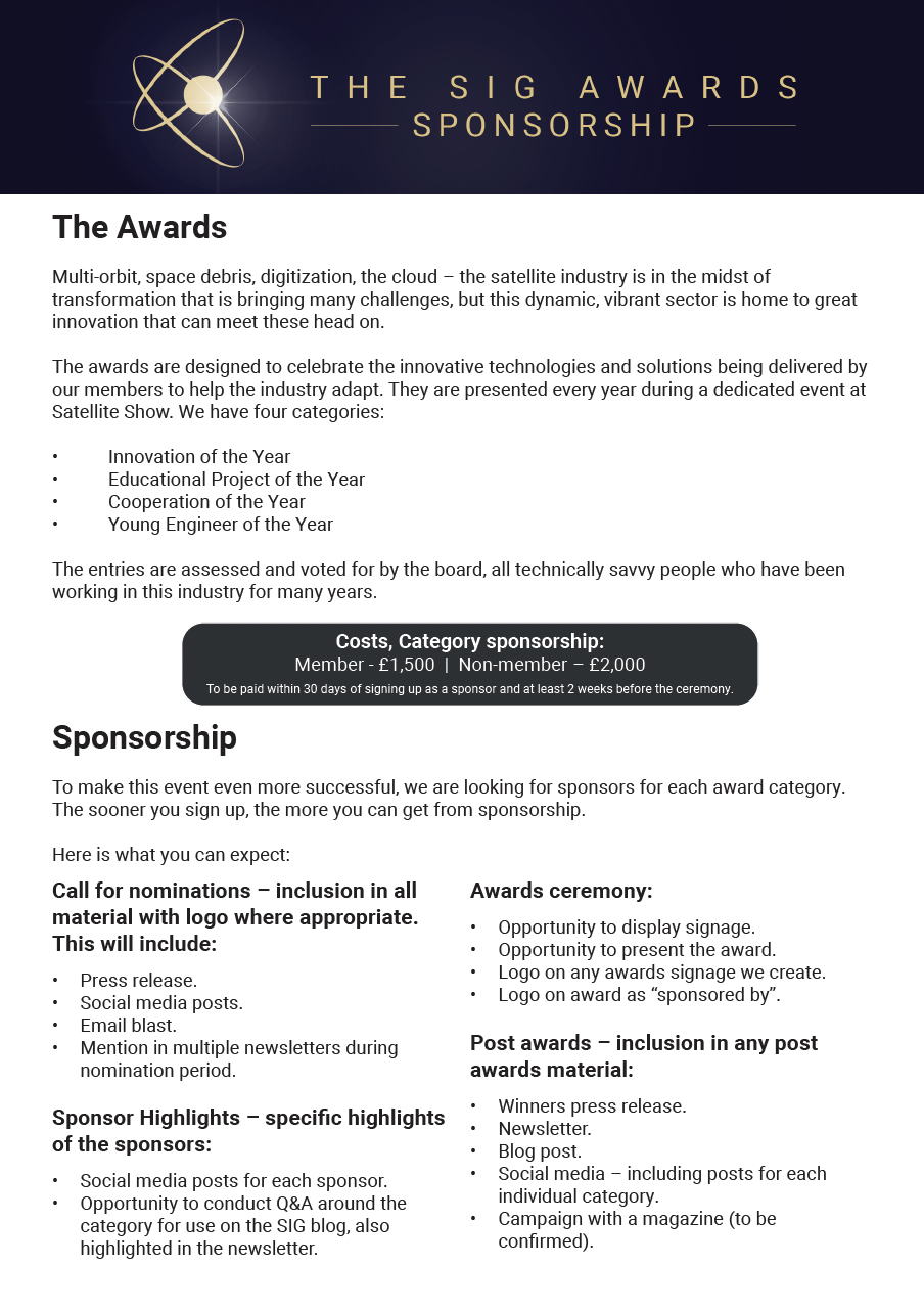 Taking place during the SATShow in March 2026, the SIG Awards celebrate the people, projects, and organisations pushing boundaries in satellite and space communications. Sponsoring the awards offers a unique opportunity to align your brand with innovation and excellence at the heart of our industry.